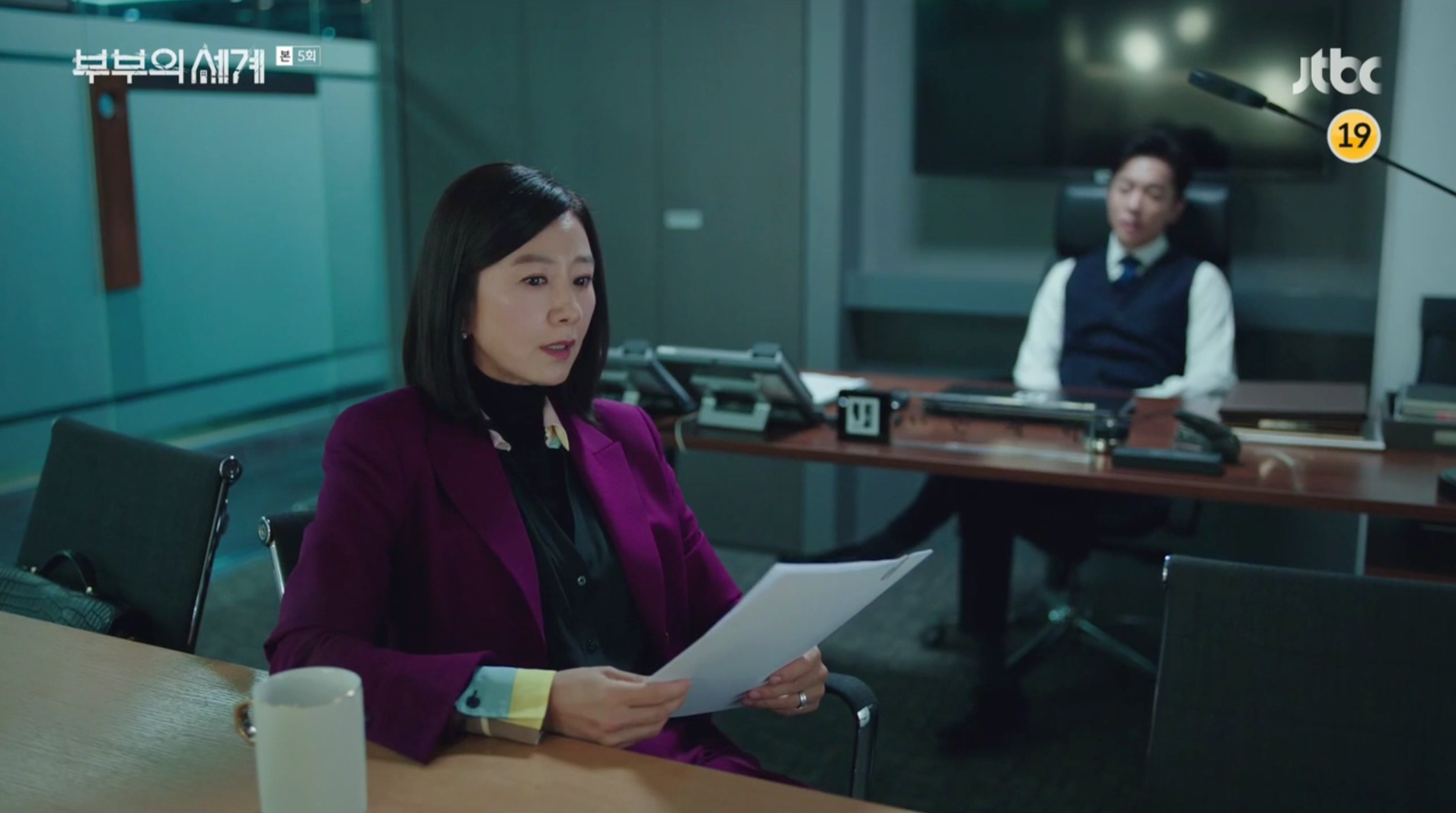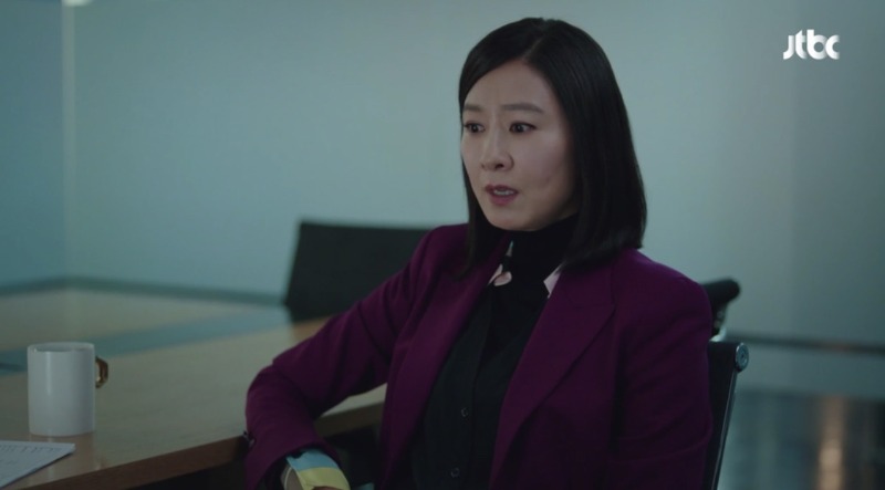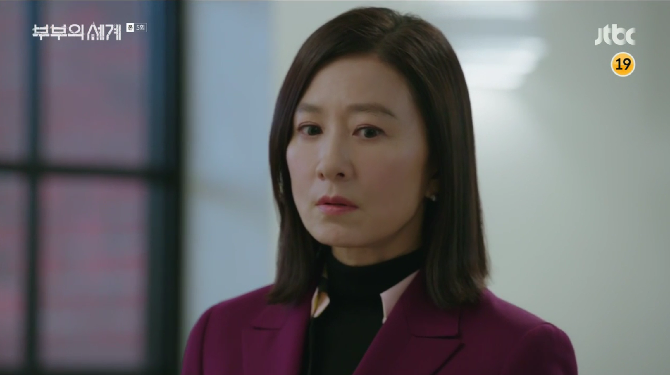 5회에서 와인색 수트와 함께 이너로 매치한 블랙 컬러의 블라우스인데요,