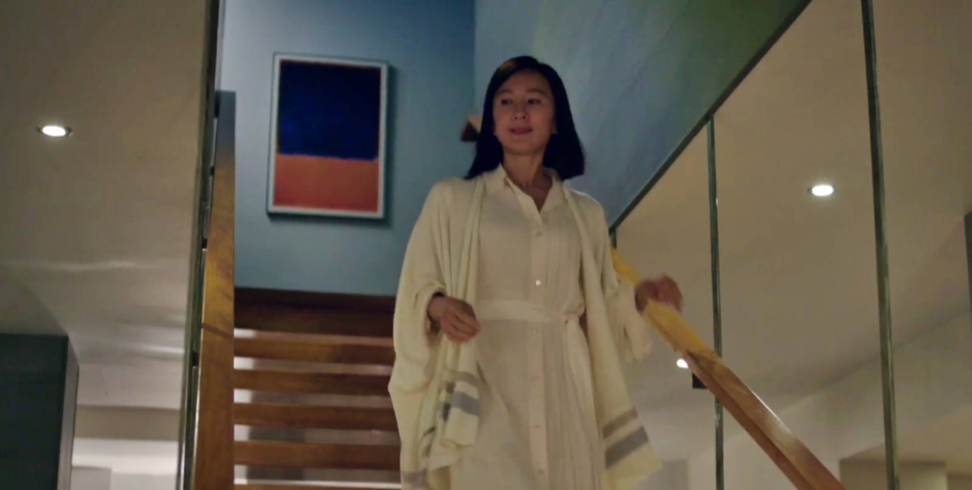 - 김희애 하늘색 실크 블라우스, 블루 스커트