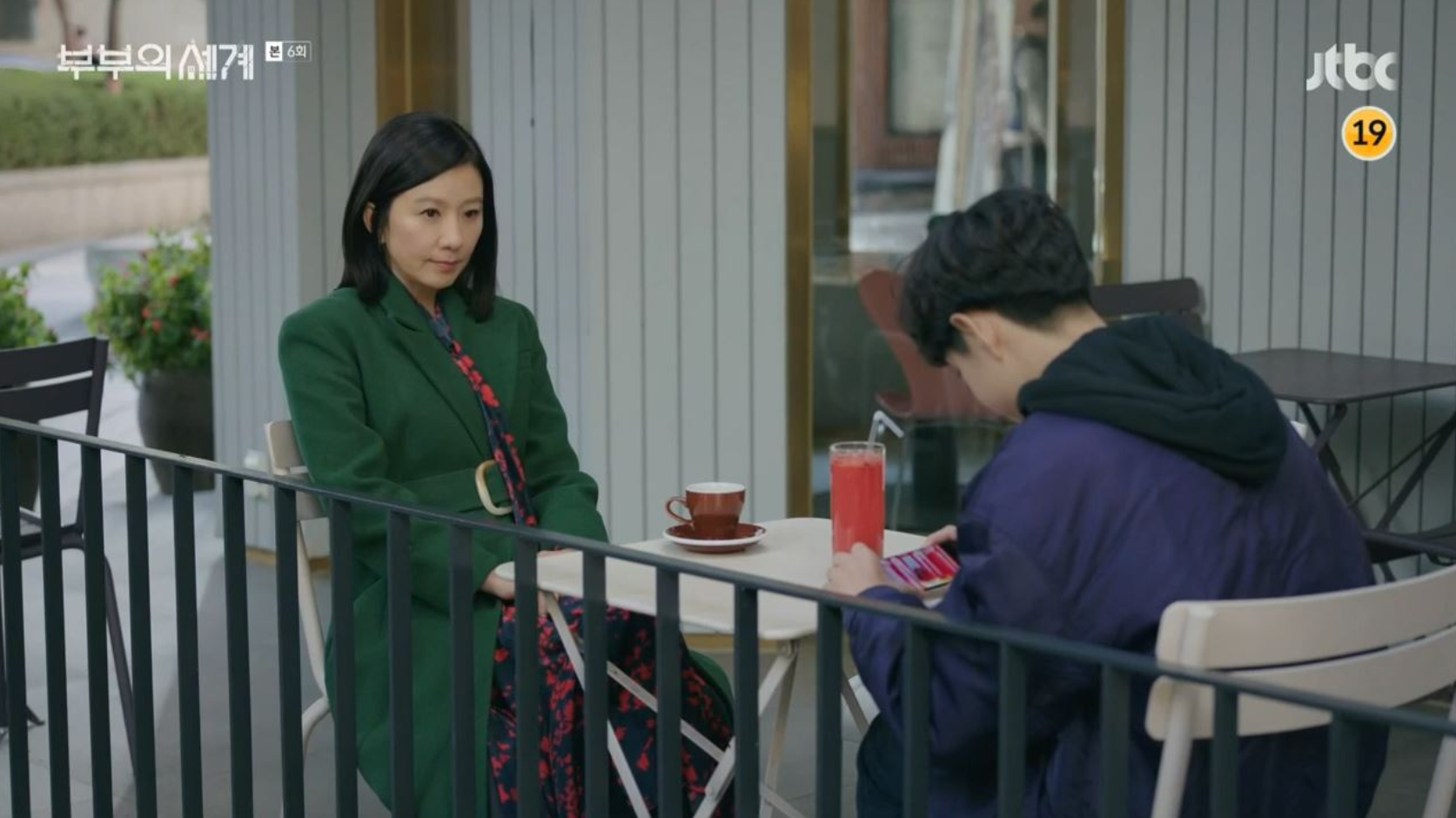 부부의세계 6화에서 초록색 롱 코트를 입고 아들과 카페에 앉아있는 장면이 있었는데요,