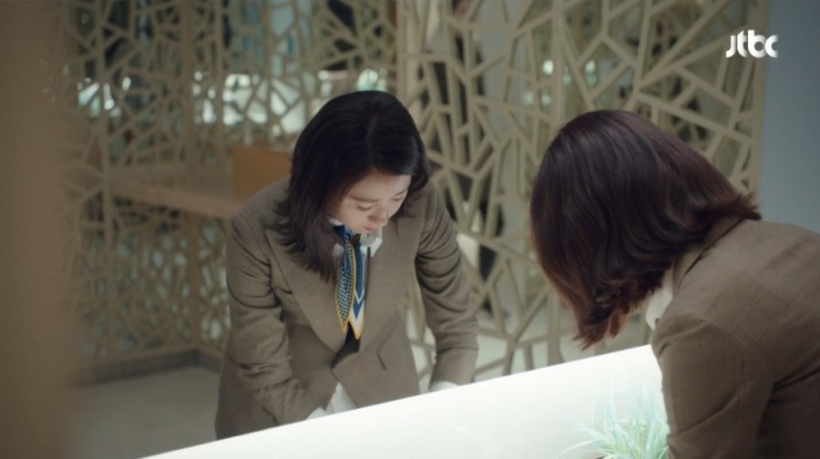 - [9회] 김희애 카키색 정장 세트(리본 체크 블라우스, 자켓, 슬랙스)