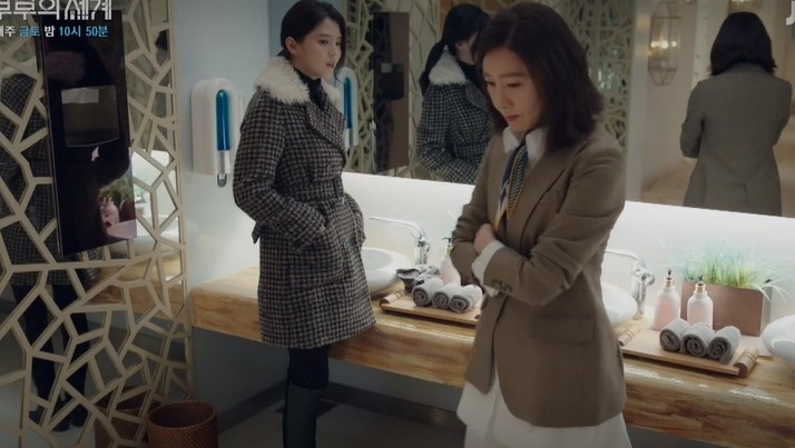 9화 초반에 나왔던 씬인데요, 한소희와 화장실에서 기싸움을 하는 장면이었습니다.